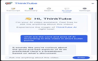 ThinkTube är en kostnadsfri webbläsartillägg för Chrome som erbjuder användare en kraftfull lösning för att extrahera och analysera undertexter från YouTube-videor. Med AI-drivna funktioner kan användare snabbt få sammanfattningar av videoinnehåll, chatta om specifika videor och hitta exakta ögonblick på några sekunder. Detta verktyg är utformat för att spara tid och öka produktiviteten, vilket gör det till en värdefull resurs för studenter, forskare och alla som vill maximera sin tid på plattformen.